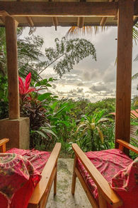 The studio is situated on the ground level of the house and has its own independent entrance. Jungle views surround the side of the unit, while the front faces the ocean. A private terrace includes a couch on the side and a small outdoor sitting area in front.